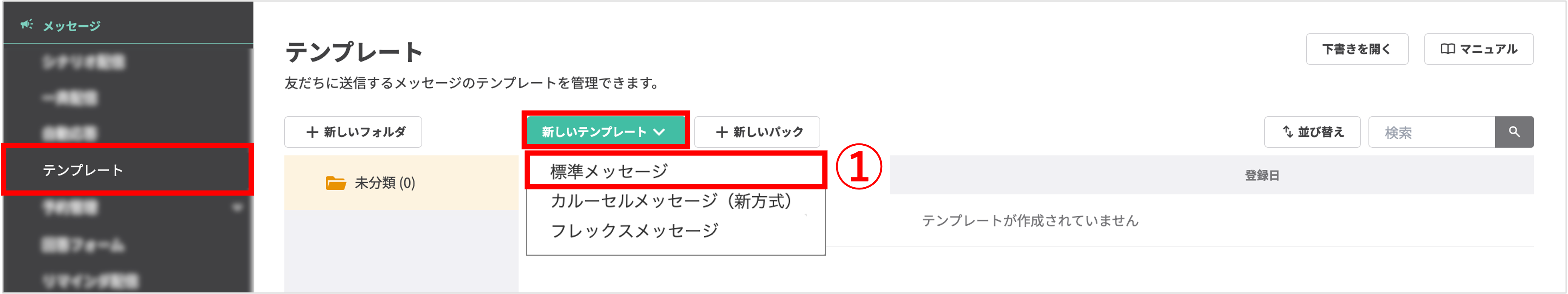 ①〔テンプレートを作成〕>「標準メッセージ」をクリックします。