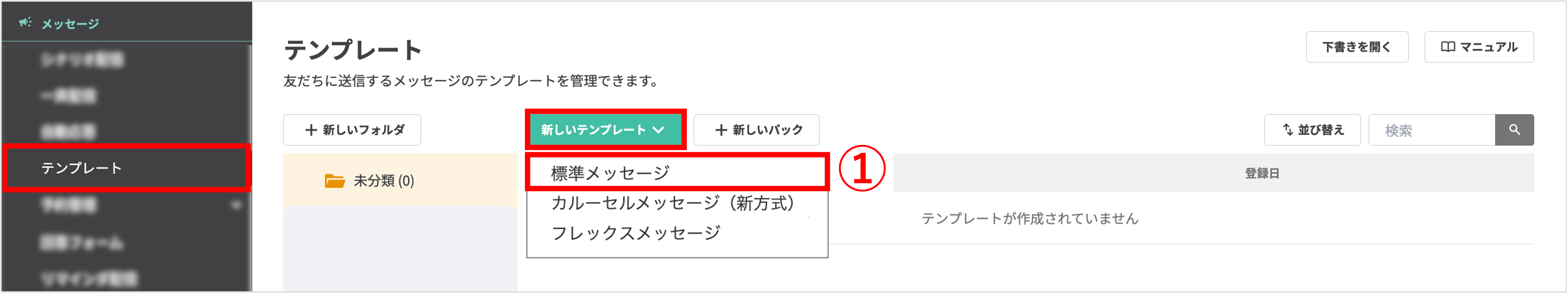 ①〔テンプレートを作成〕>〔標準メッセージ〕をクリックします。