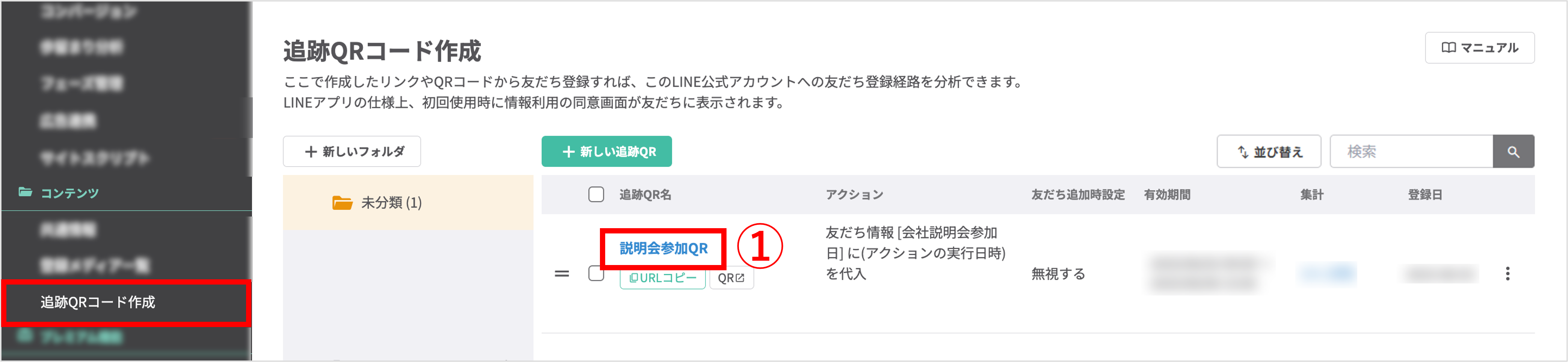 ①作成した開催イベントのQRコードの追跡QR名をクリックします。