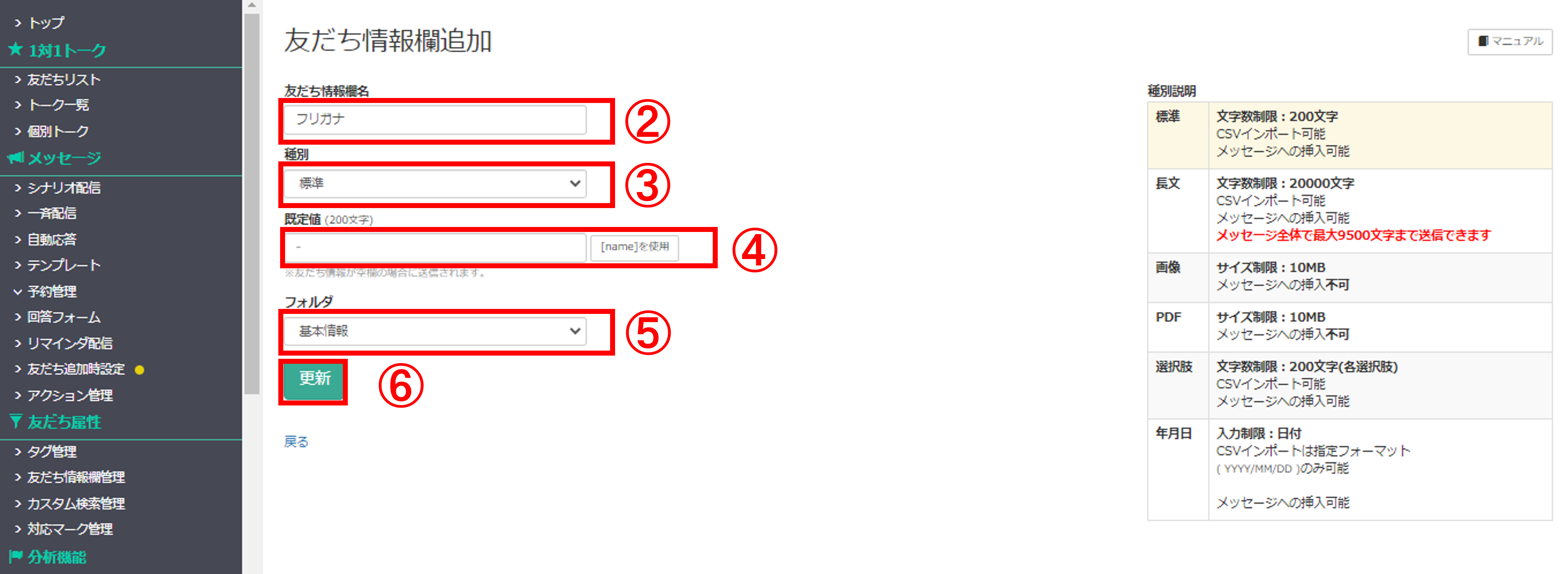 〔+新しい友だち情報欄〕ボタンをクリックします。