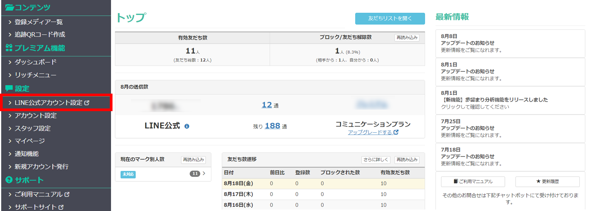 左メニュー>「LINE公式アカウント設定」をクリックします。