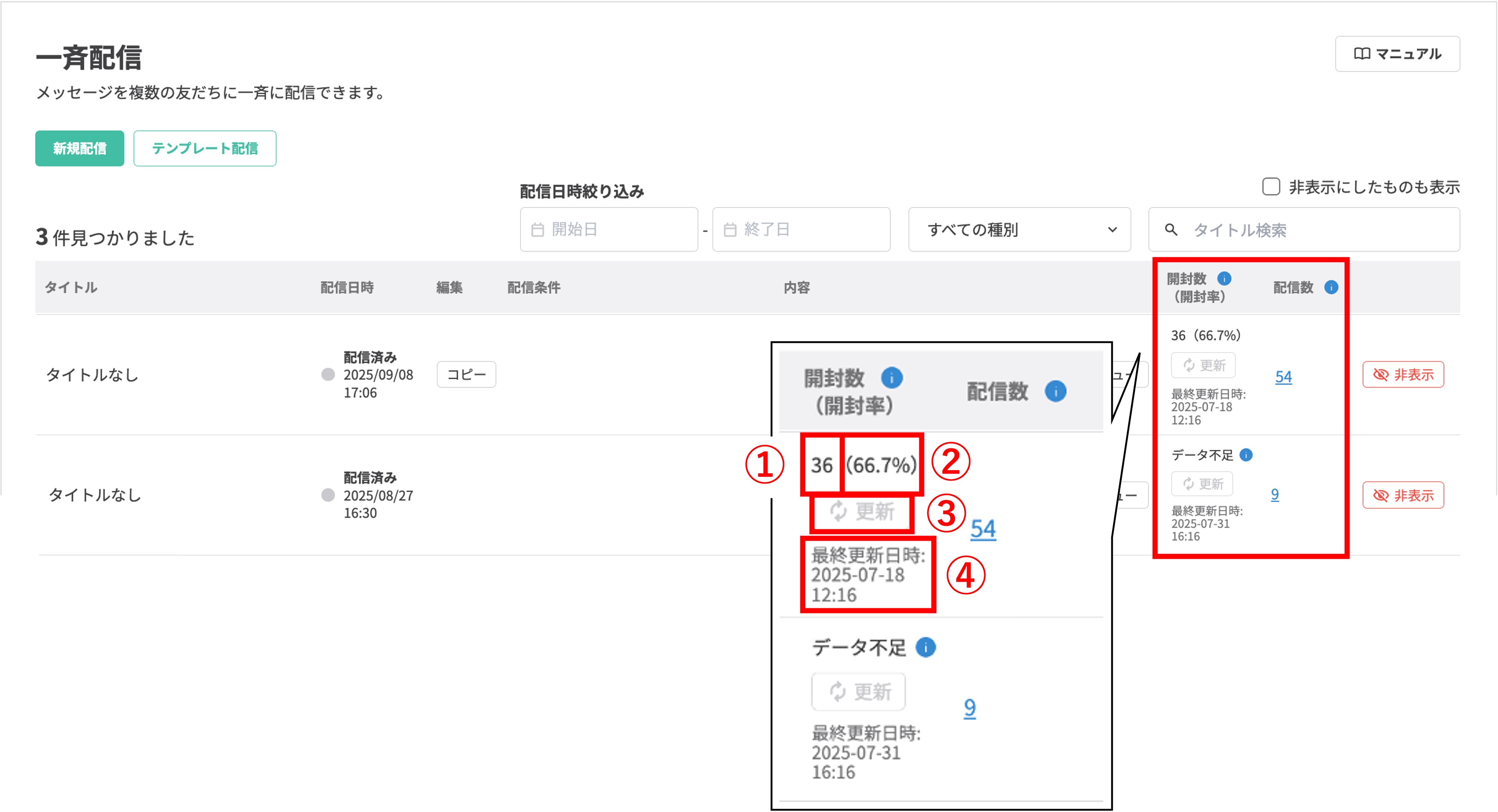 ※開封数(開封率)のデータは、1時間に30配信ずつ、更新日時が古い配信から順にシステムが自動で更新します。