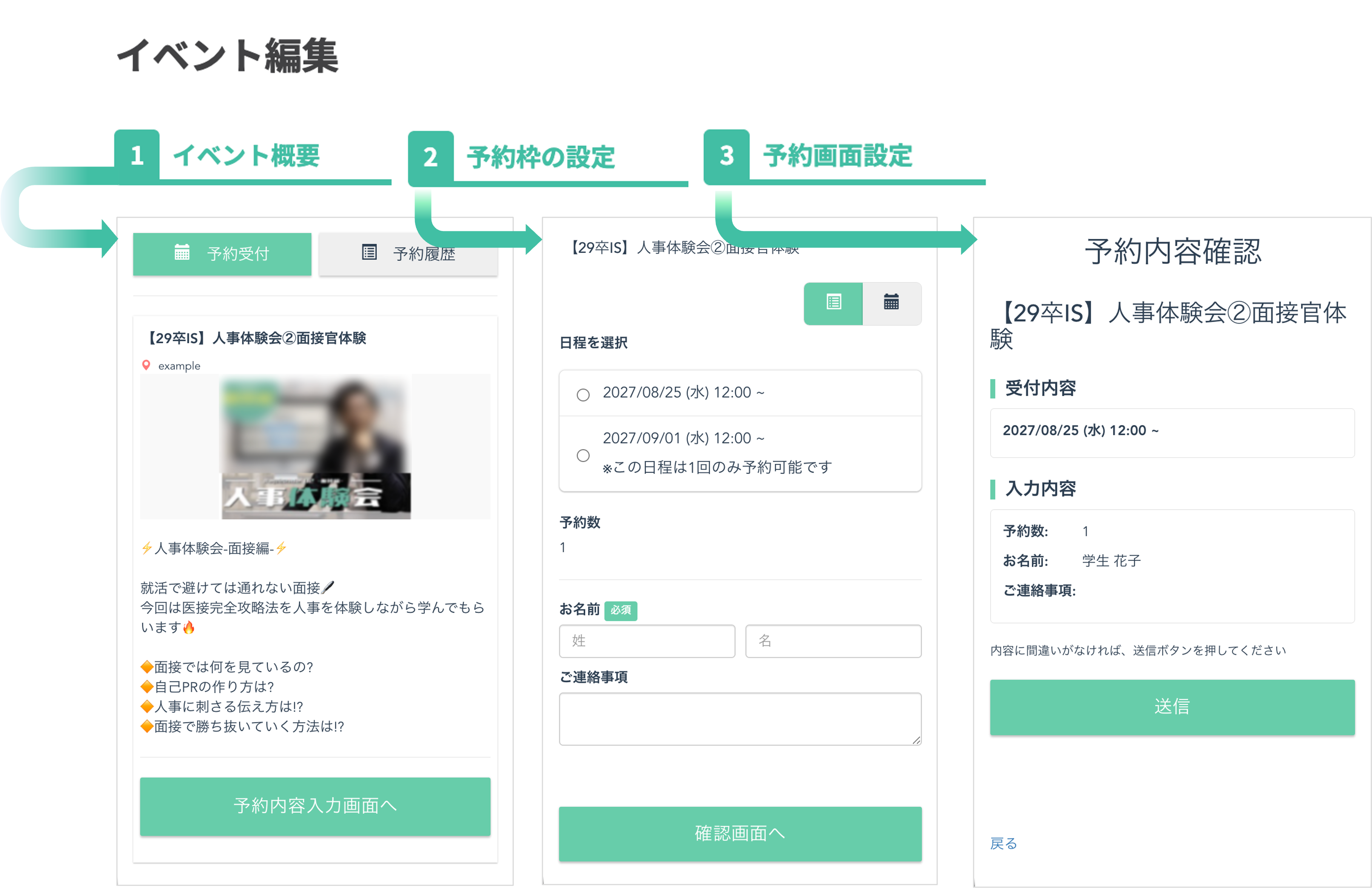 イベント予約作成は『イベント概要』、『予約枠の設定』、『予約画面設定』の三段階に分かれて設定を行います。