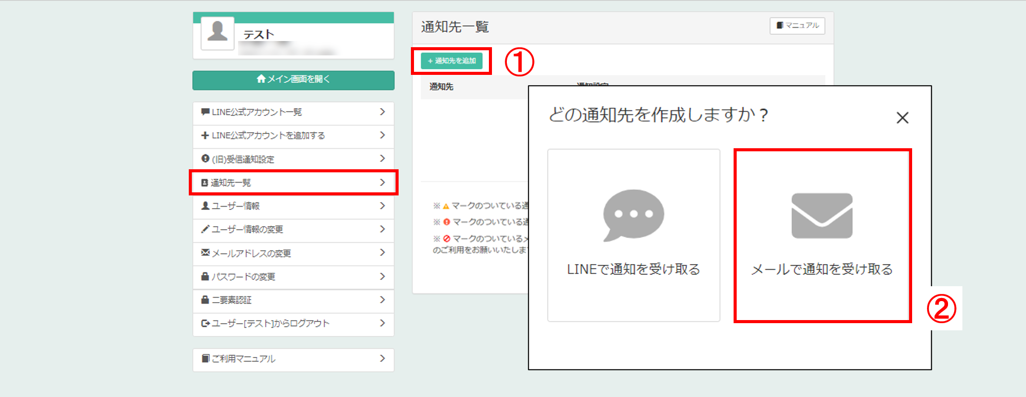 ① 通知の設定方法で〔+通知先を追加〕ボタンをクリックした後に、〔メール〕ボタンをクリックします。