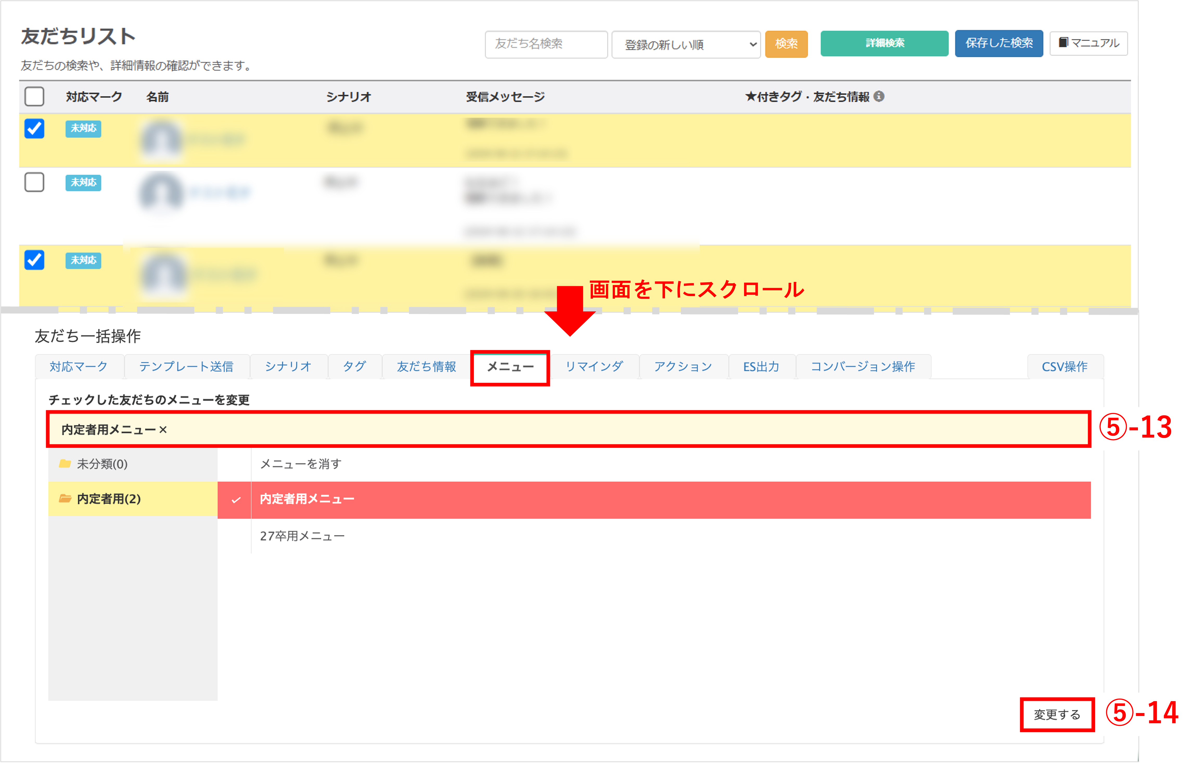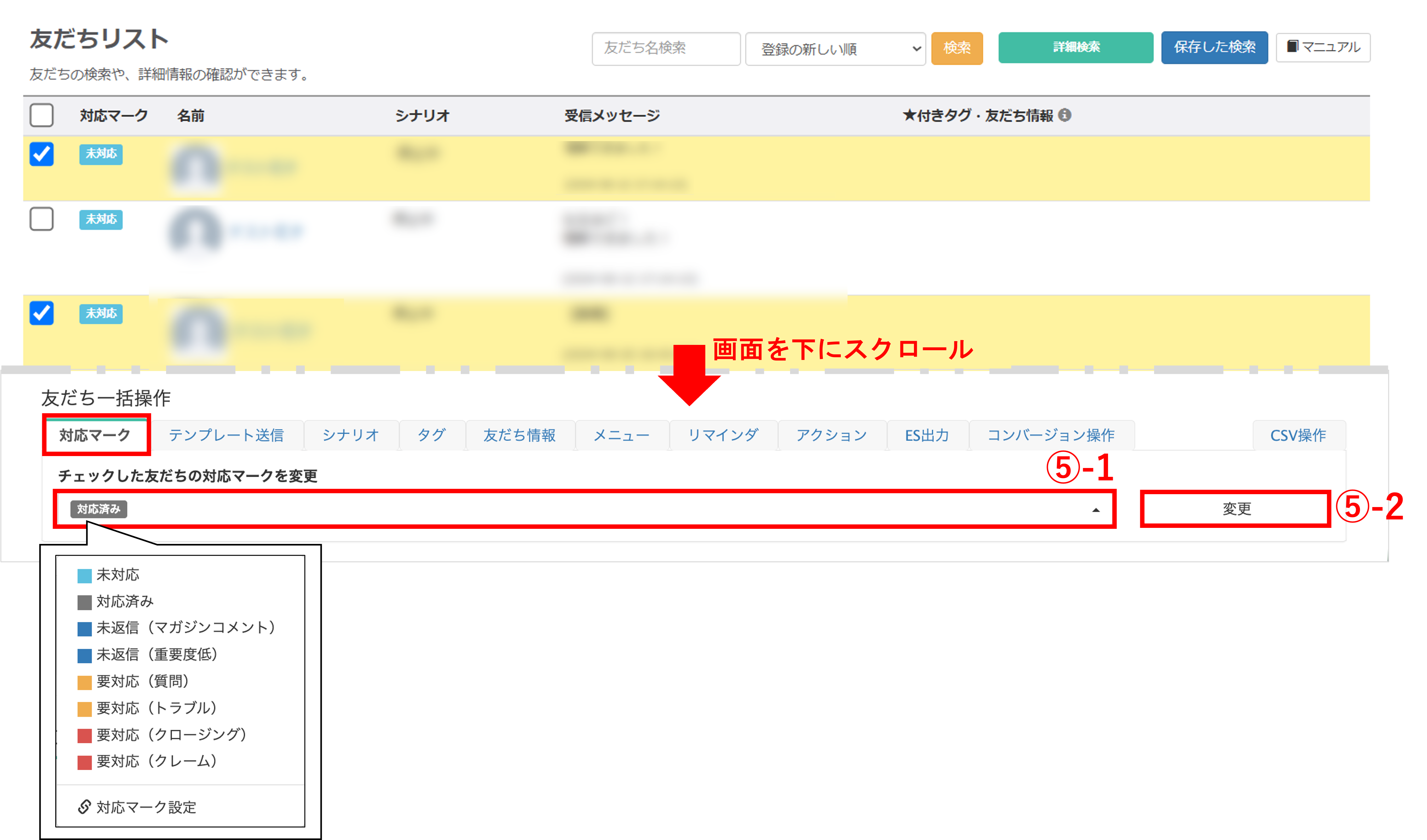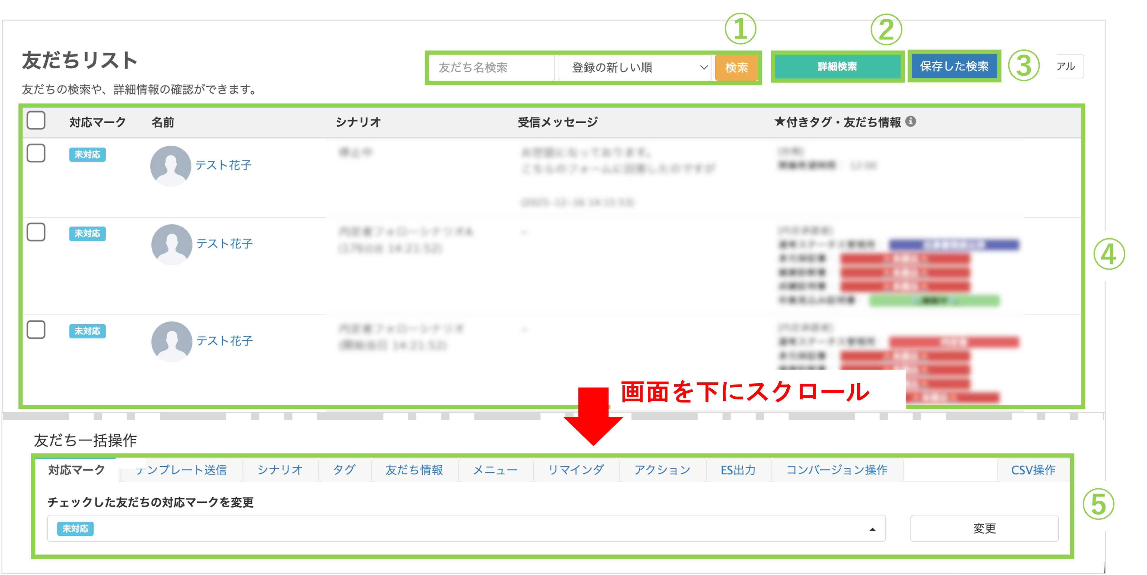 ④-2 各タブから知りたい情報を見たり、シナリオや友だち情報、タグの操作ができます。