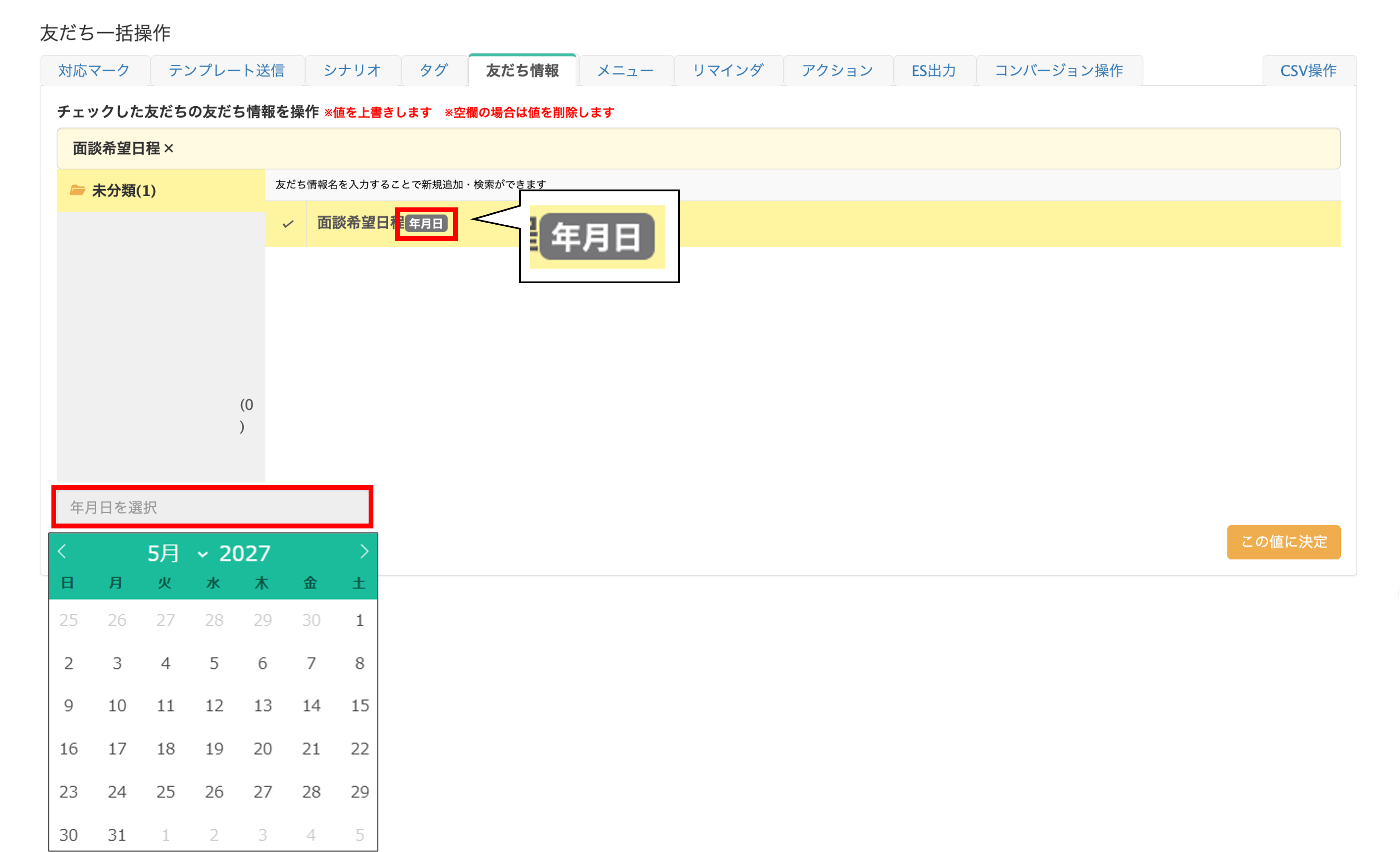 ⑤-17『ゴール日時』『日付』を指定するか、『友だち情報の日付を指定』を選択します。