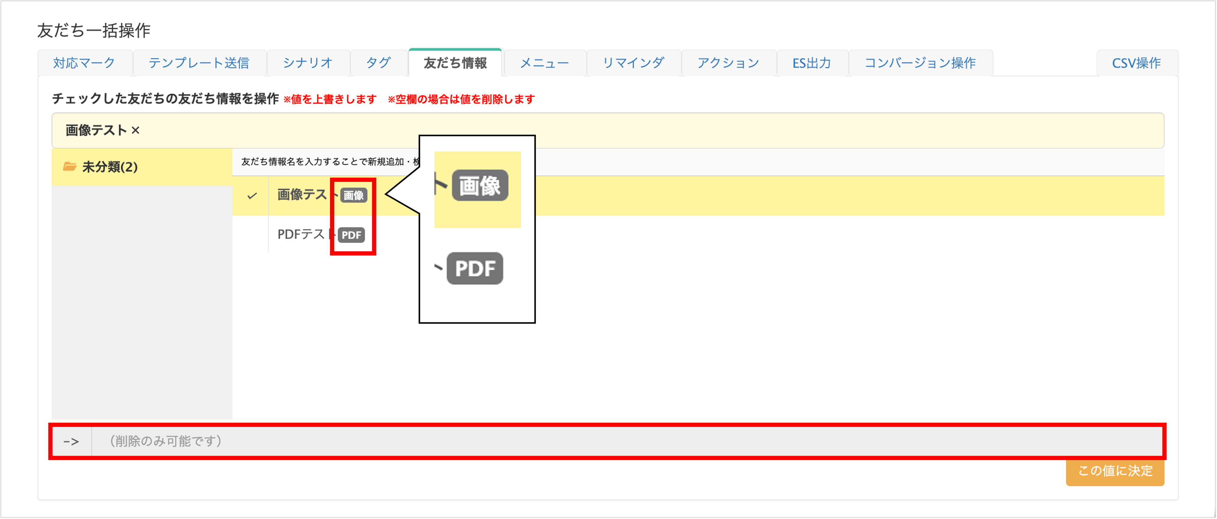 友だち情報の種別によって、変更後の値を入力する画面の表示が異なります。