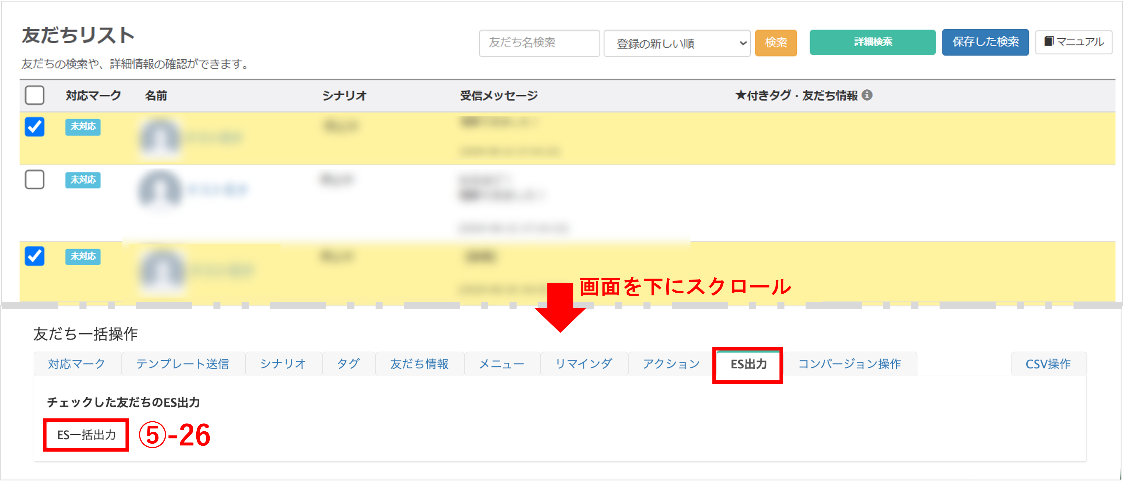 ★友だちリストから下にスクロールし、ES出力』タブに切り替えます。