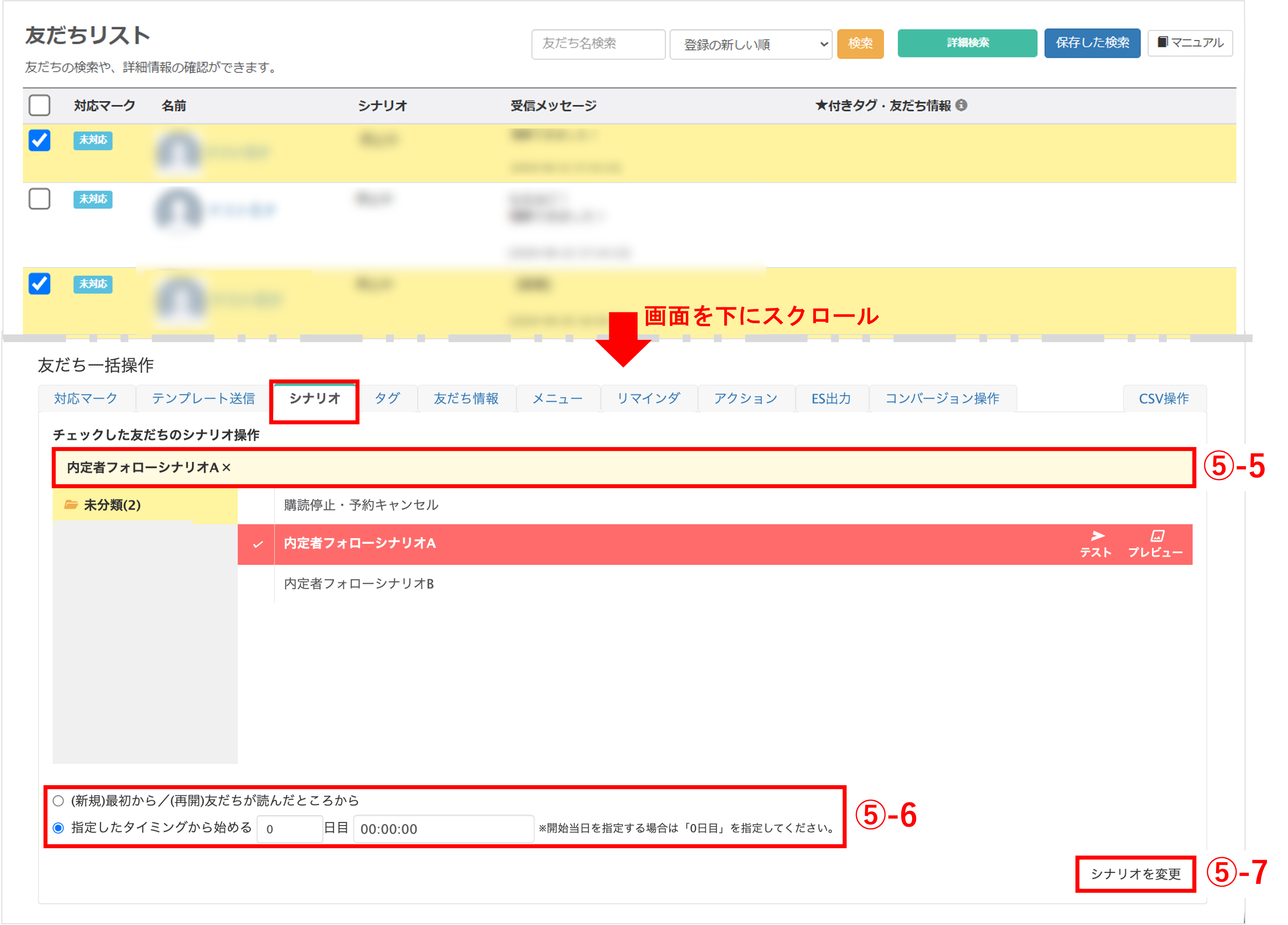 友だちリストから下にスクロールし、シナリオ』タブに切り替えます。