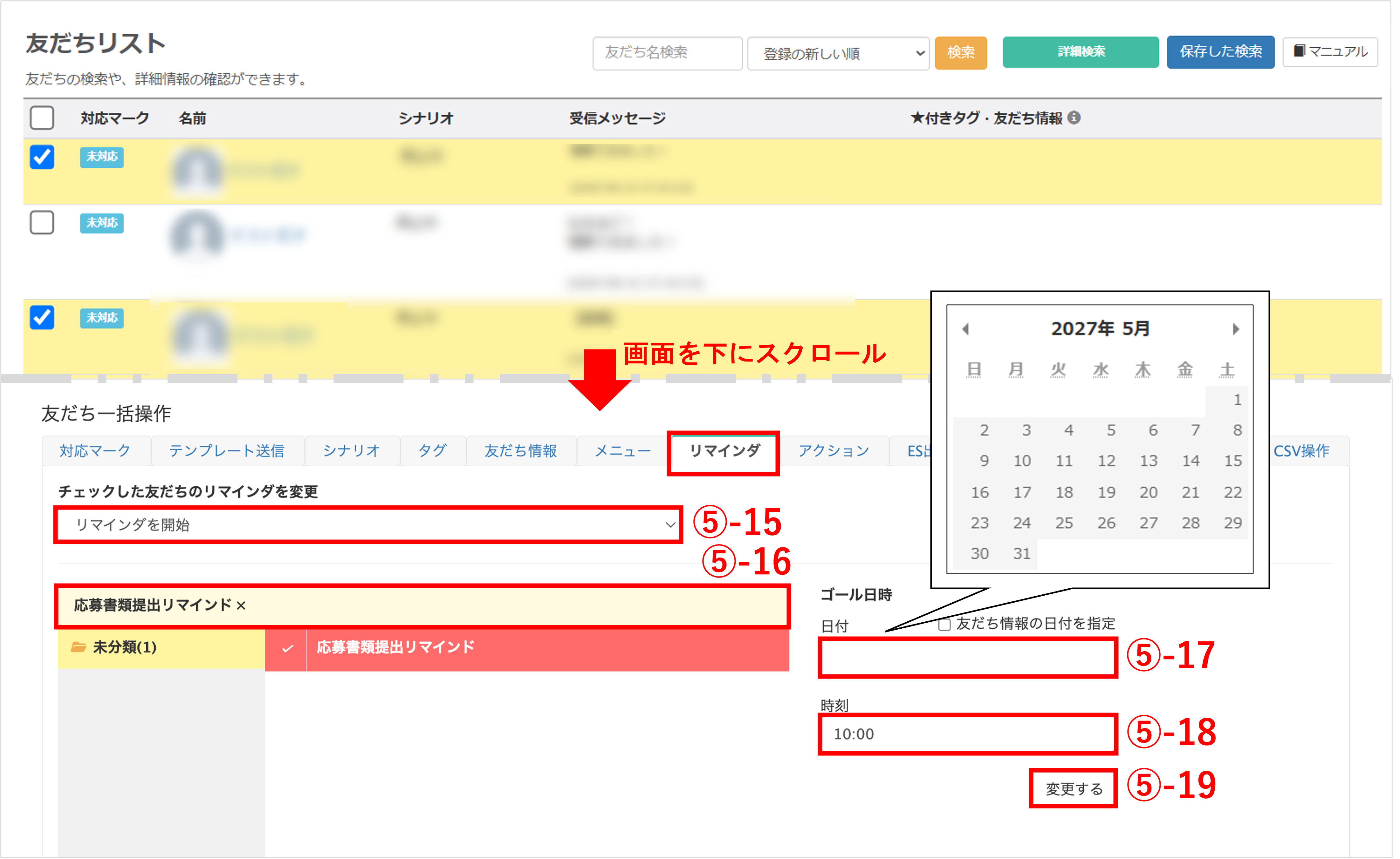 ⑤-15『チェックした友だちのリマインダを変更』【リマインダを開始】を選択します。