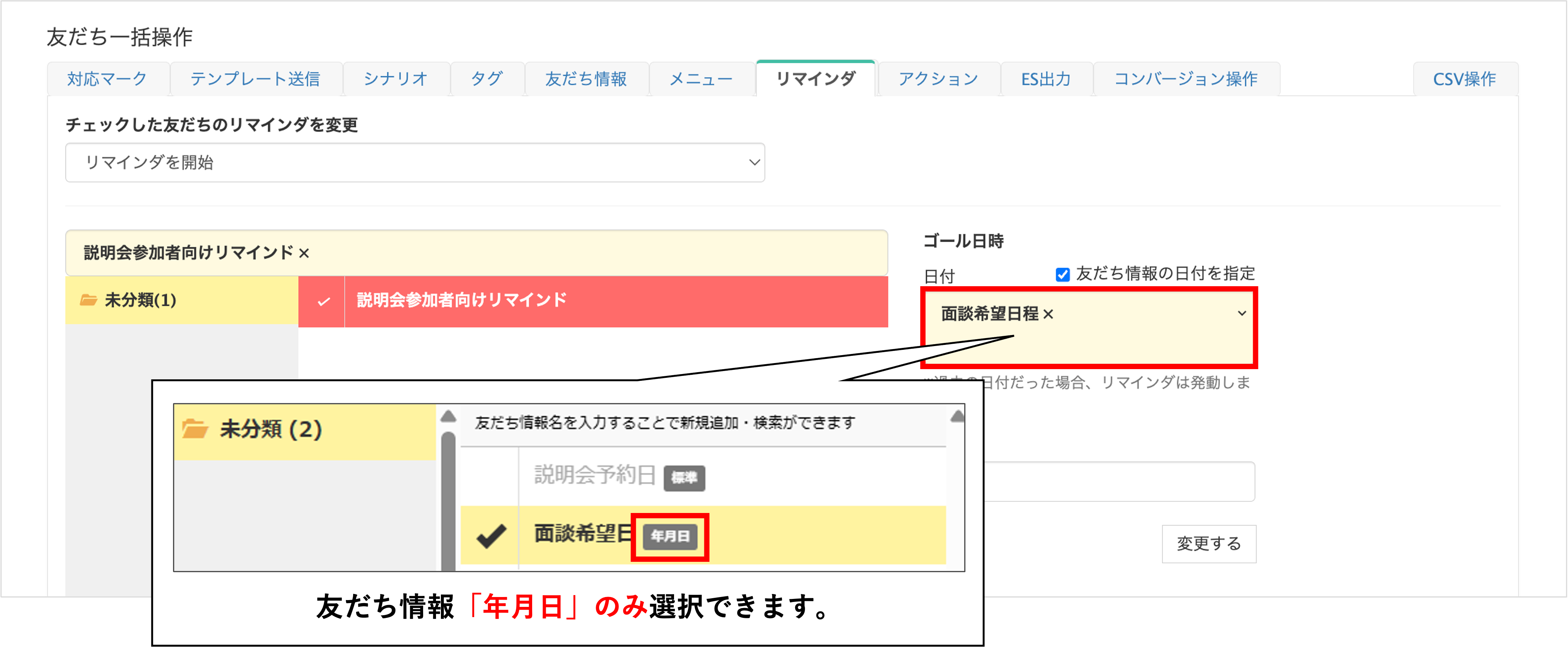 ★指定した「年月日」の友だち情報が未登録】または【過去の日付】の場合、該当する友だちに対してリマインダは配信されません。