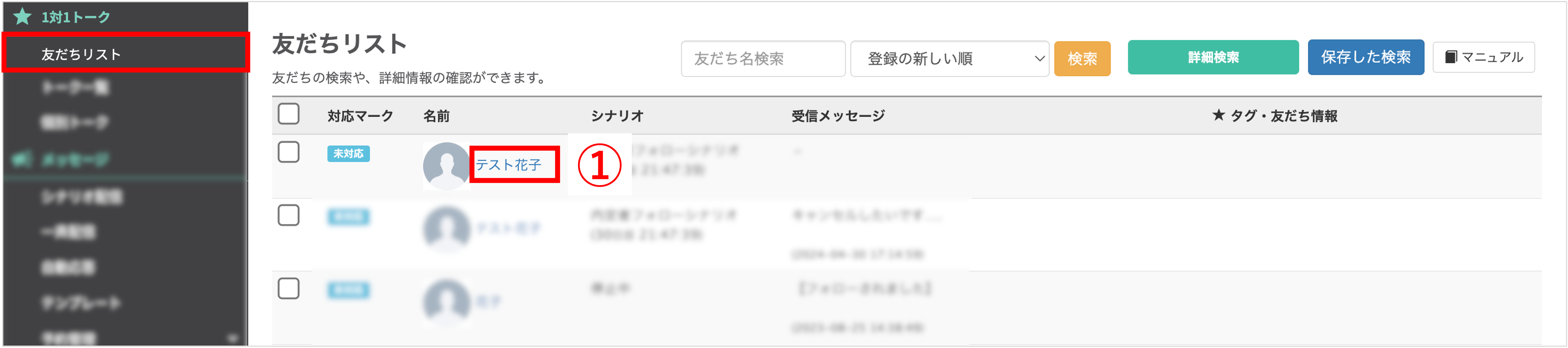 ①選考ステータスを変更したい友だちの名前をクリックします。