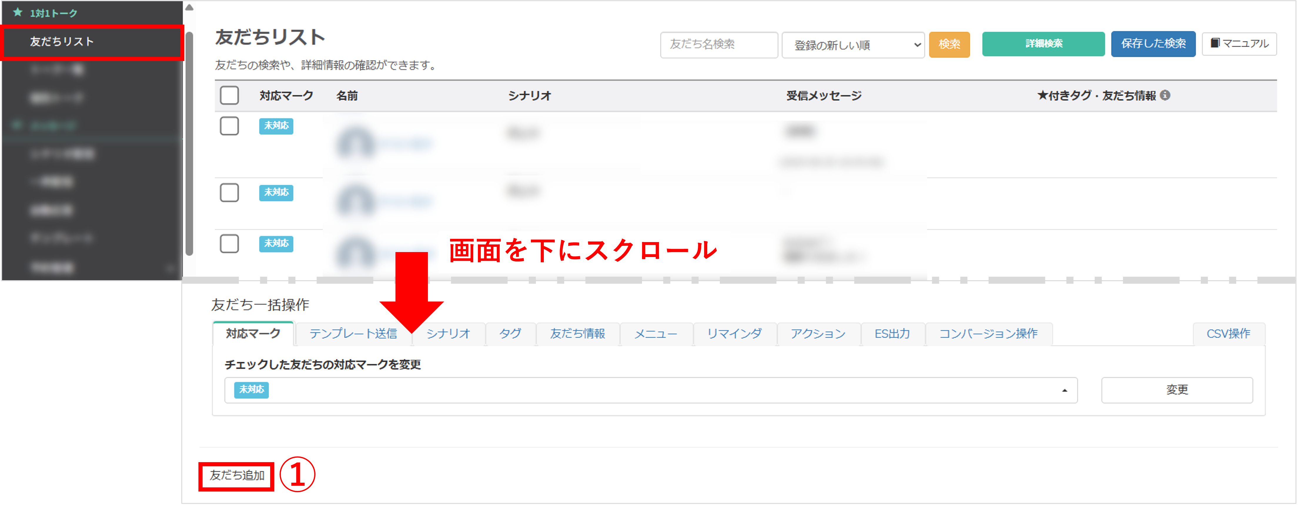 ①画面を下にスクロールし、〔友だち追加〕ボタンをクリックします。