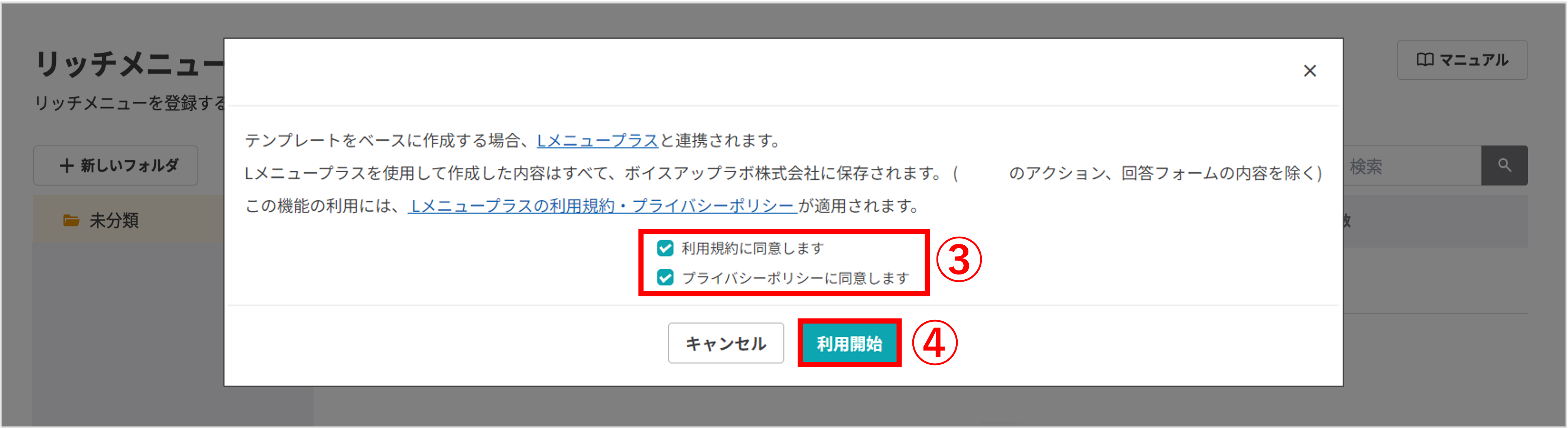 ③Lメニュープラスの利用規約およびプライバシーポリシーの内容を確認し、チェックボックスにチェックを入れます。