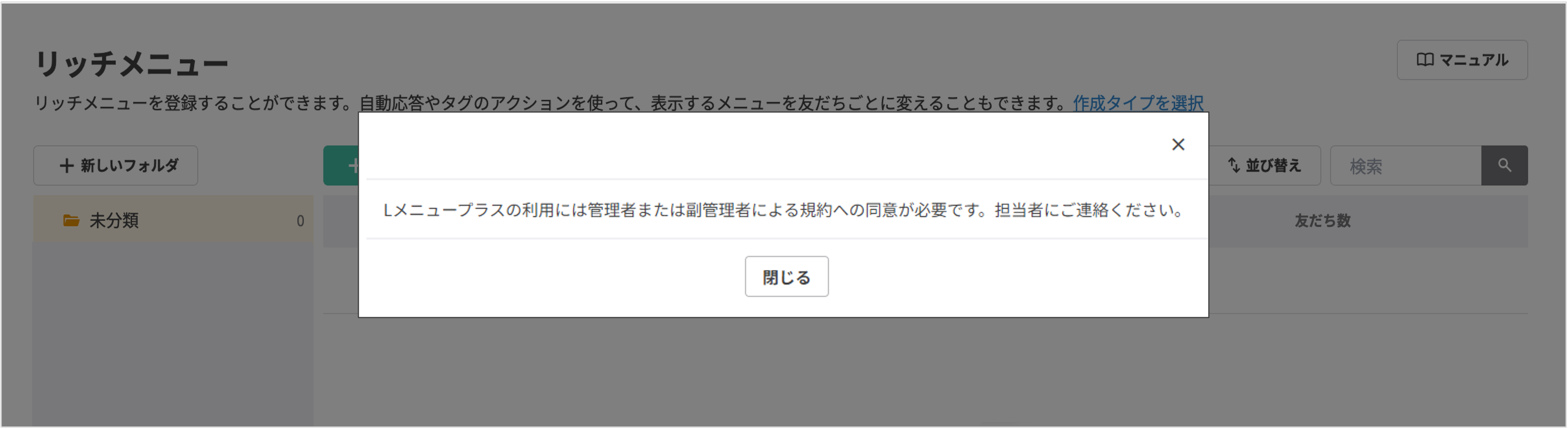 ★管理権限が管理者または副管理者以外の場合、Lメニュープラス初回利用時には下記画面が表示されます。