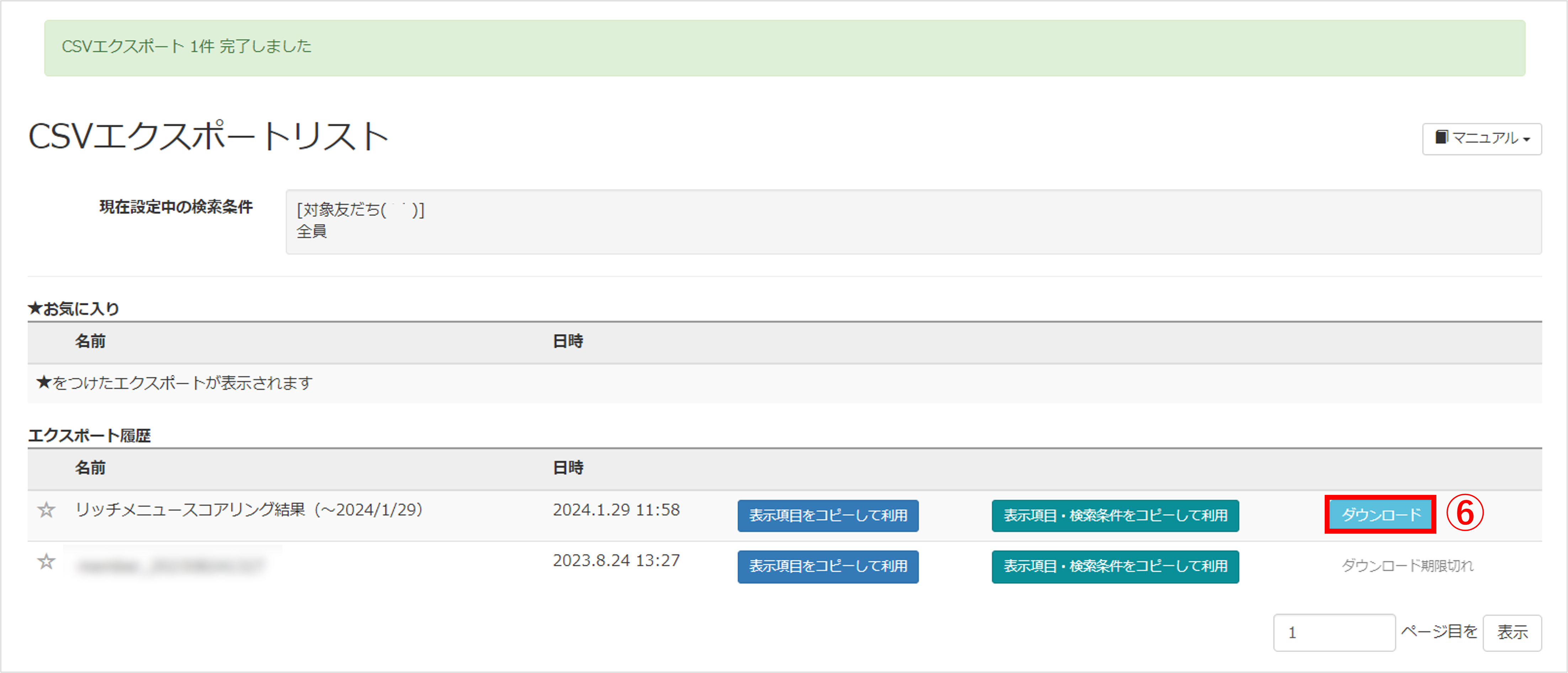⑥ダウンロード準備が完了すると〔ダウンロード〕ボタンが表示されます。クリックして登録者ごとのタップ数が記録されたCSVファイルをダウンロードします。