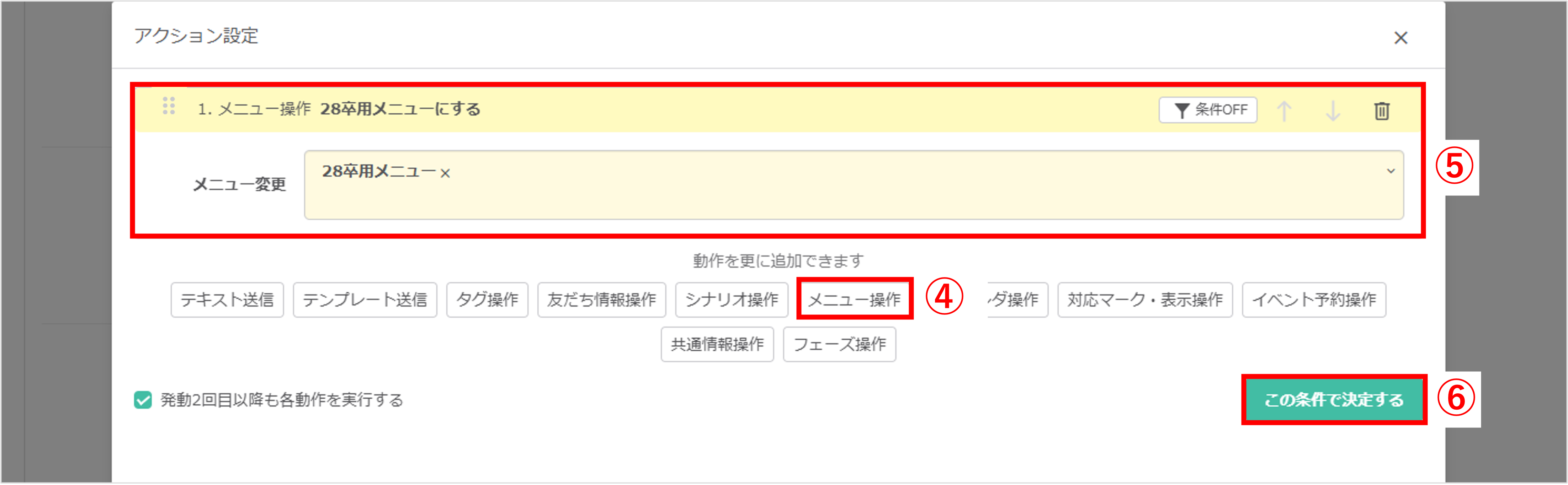 システム導入前からの友だち・アカウントへのブロックを解除した友だち』で、『リッチメニューを表示する』アクションを設定することで、ブロック解除後にもリッチメニューを表示できます。