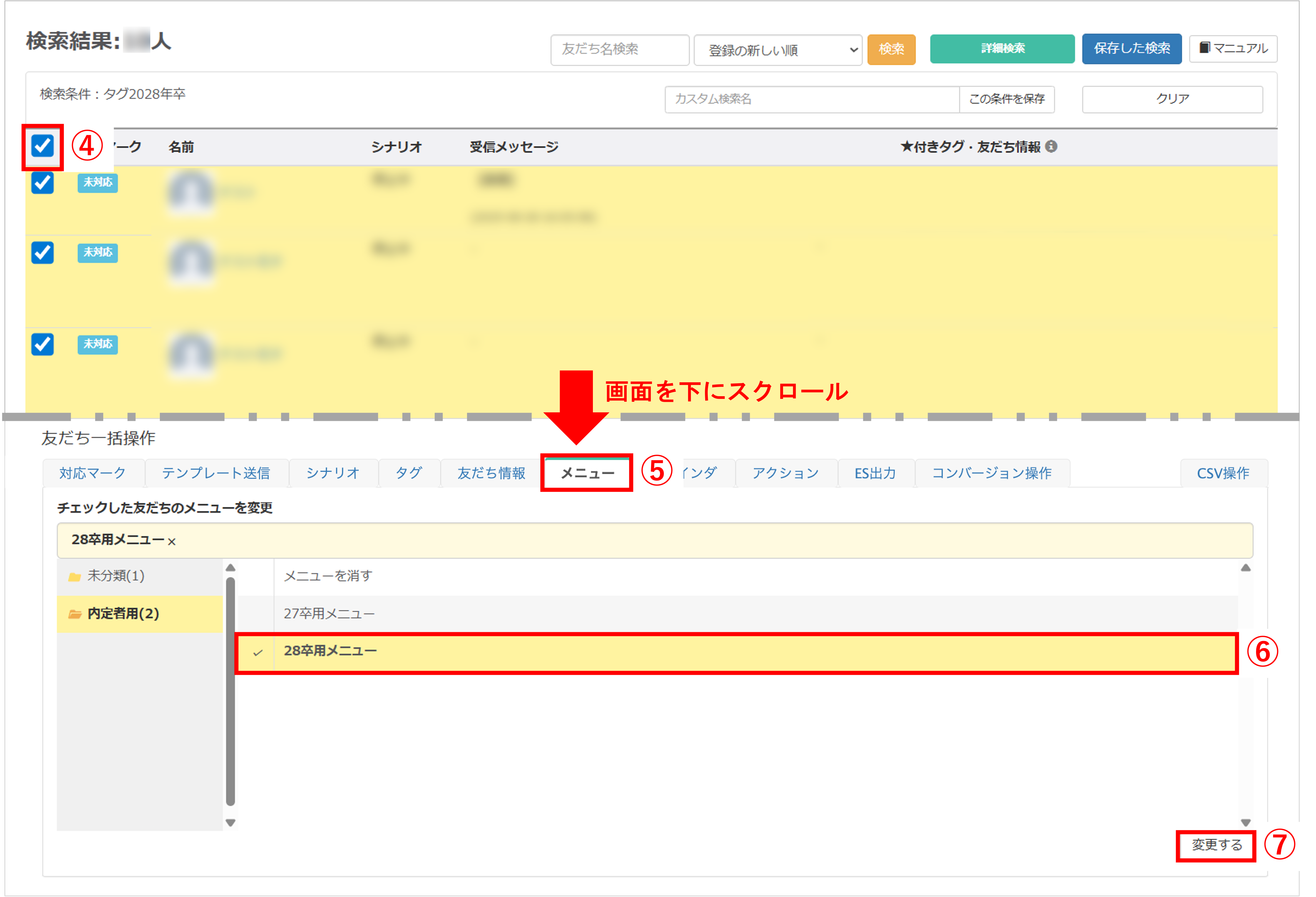 ⑤一括操作する友だちを選択したあと、画面を下にスクロールして『友だち一括操作』『メニュー』タブに切り替えます。