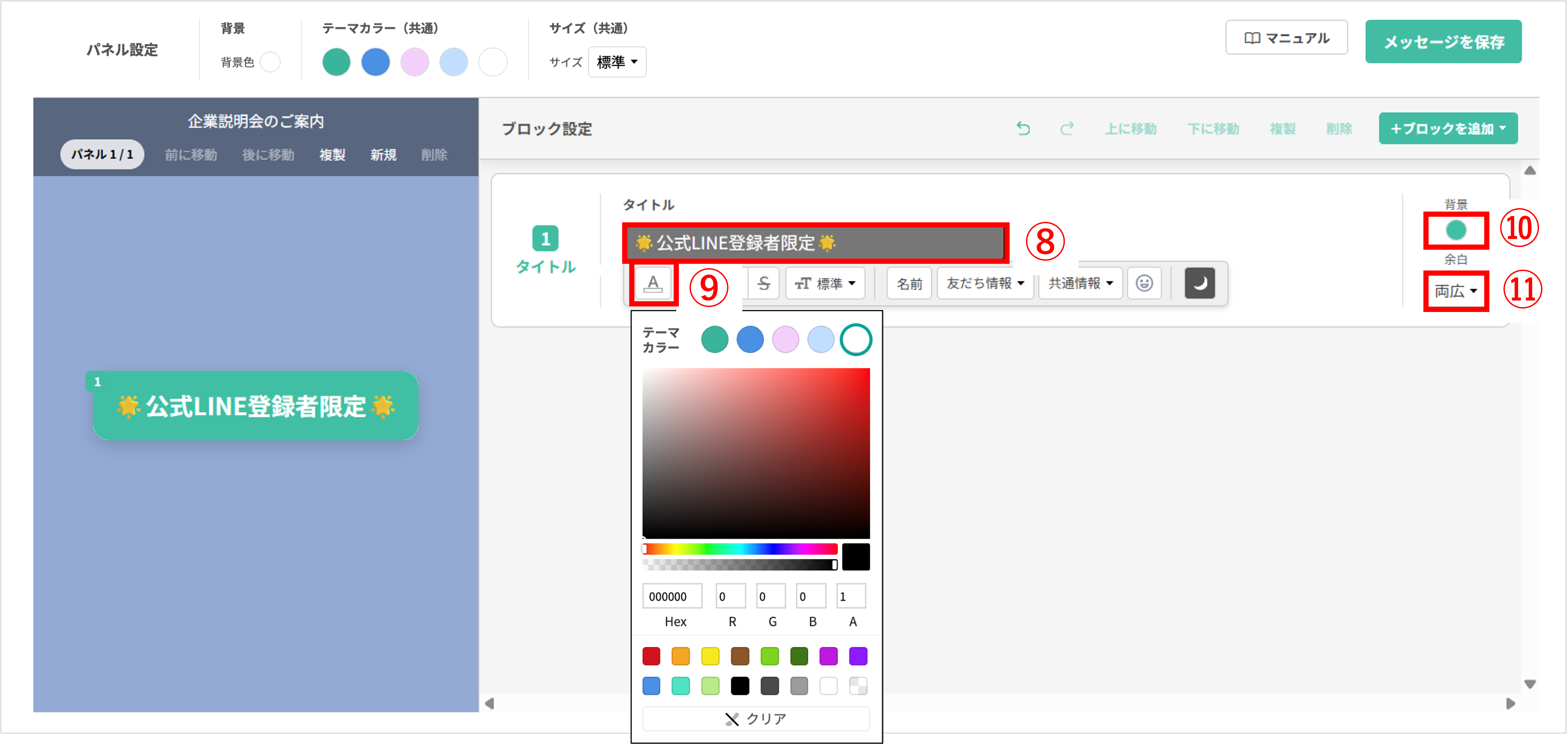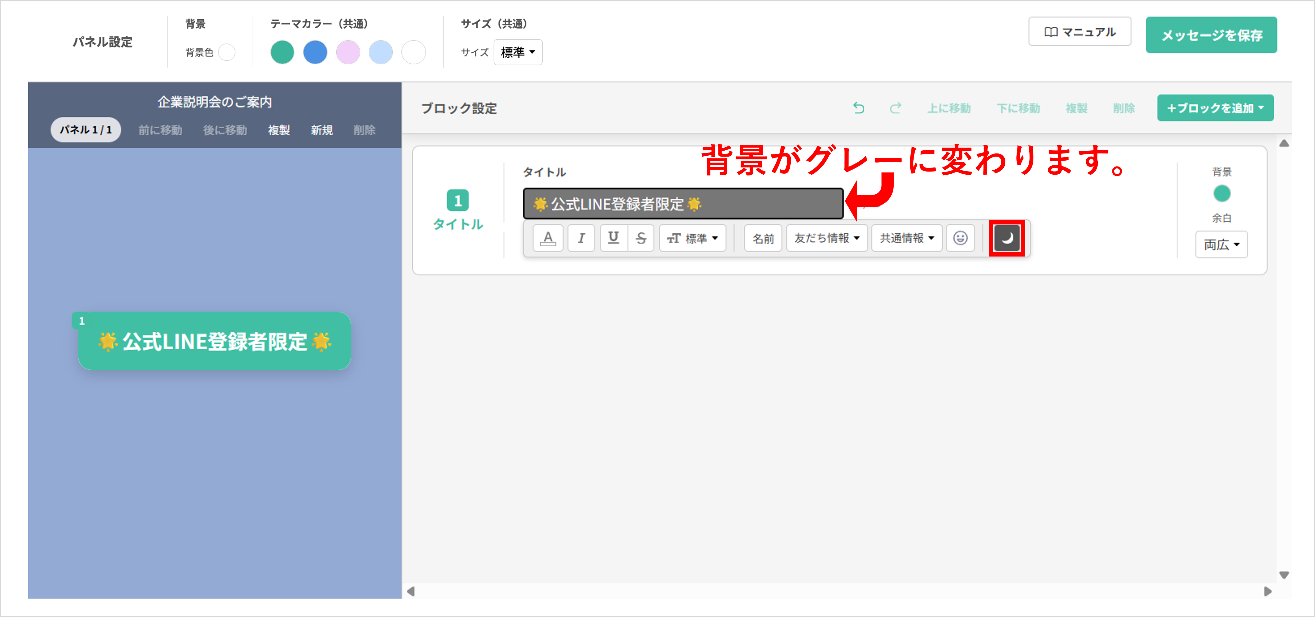 ★テーマカラーを設定しておくと、 (共通)の項目の変更内容がすべてのパネルにまとめて反映されます。また、ブロックの背景色や文字色を設定する場面でテーマカラーから簡単に選択することも可能です。
