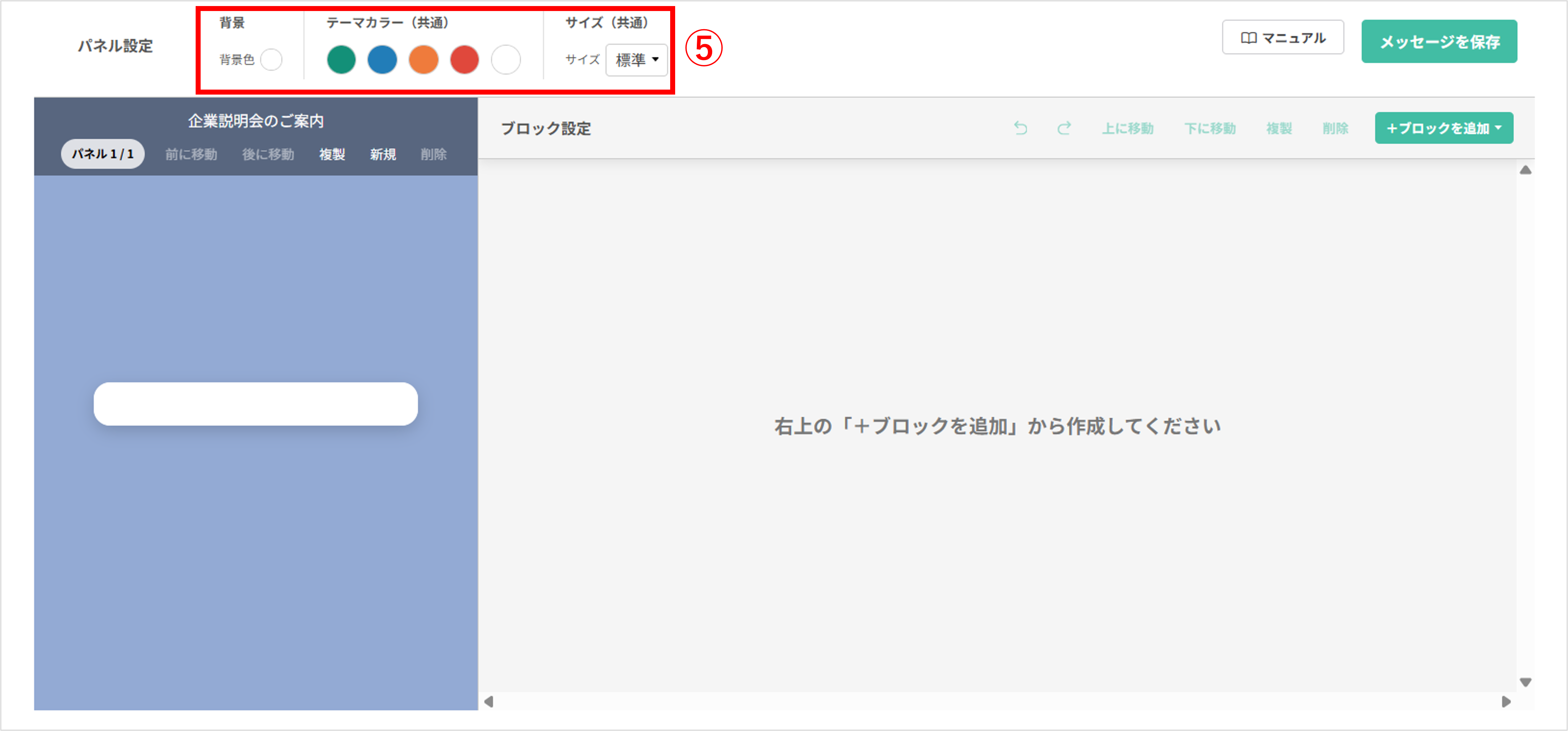 ⑤背景、テーマカラー(共通)、サイズ(共通)を設定します。