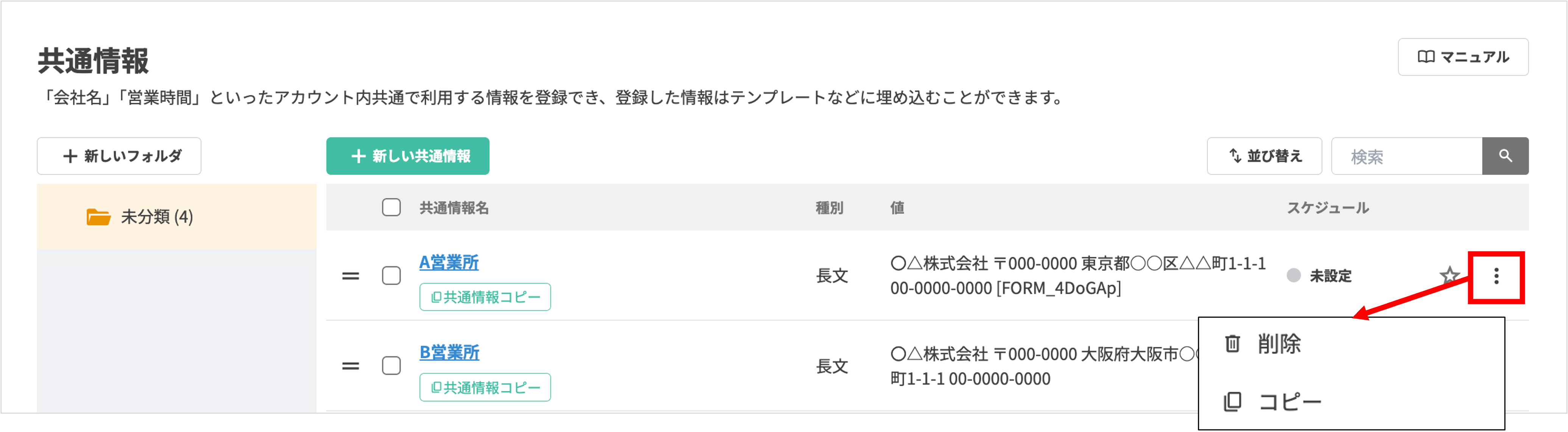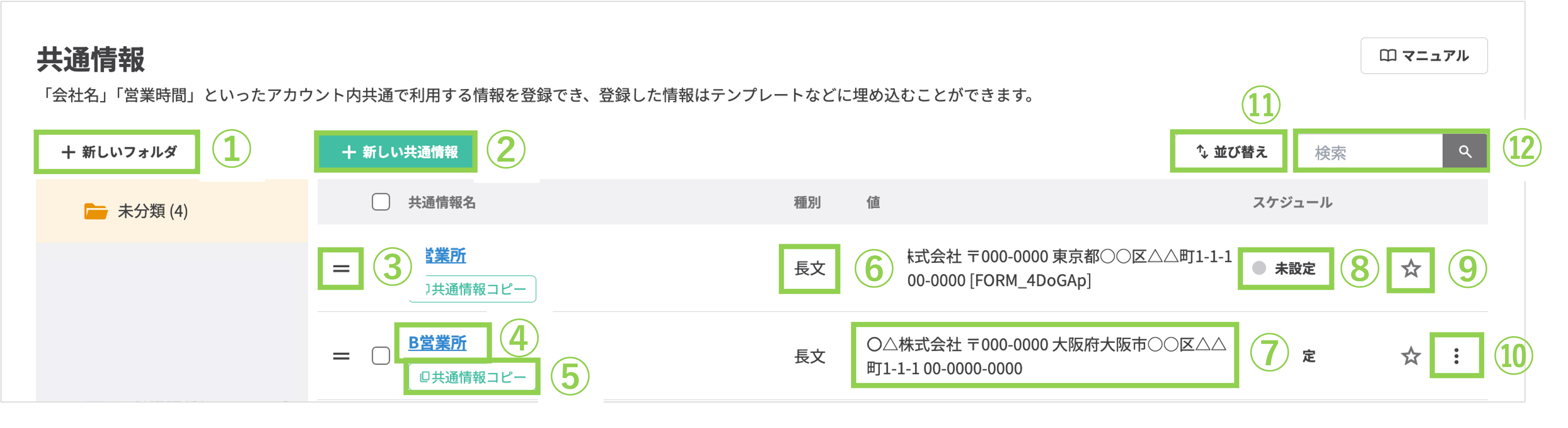 〔+新しいフォルダ〕ボタン:登録した共通情報を分類するためのフォルダを作成できます。