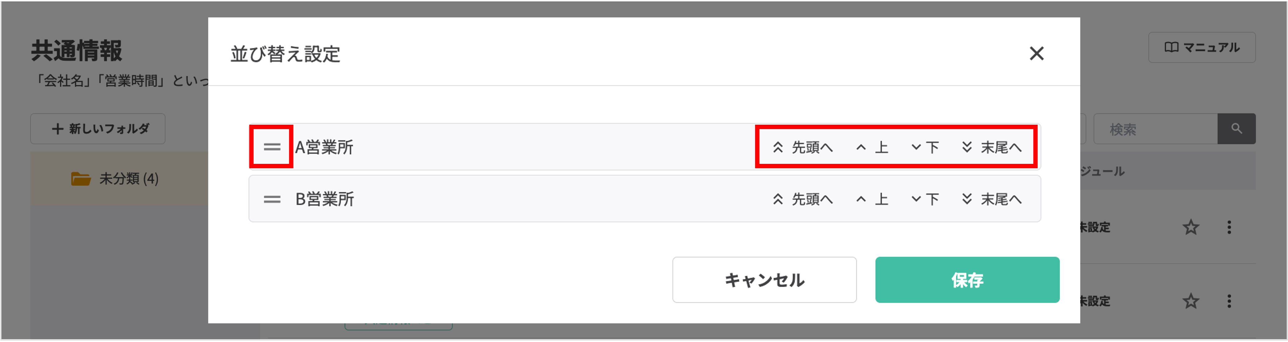 「=」をドラッグ、または「先頭へ/上/下/末尾へ」をクリックし、並び替えます。完了したら〔保存〕ボタンをクリックします。