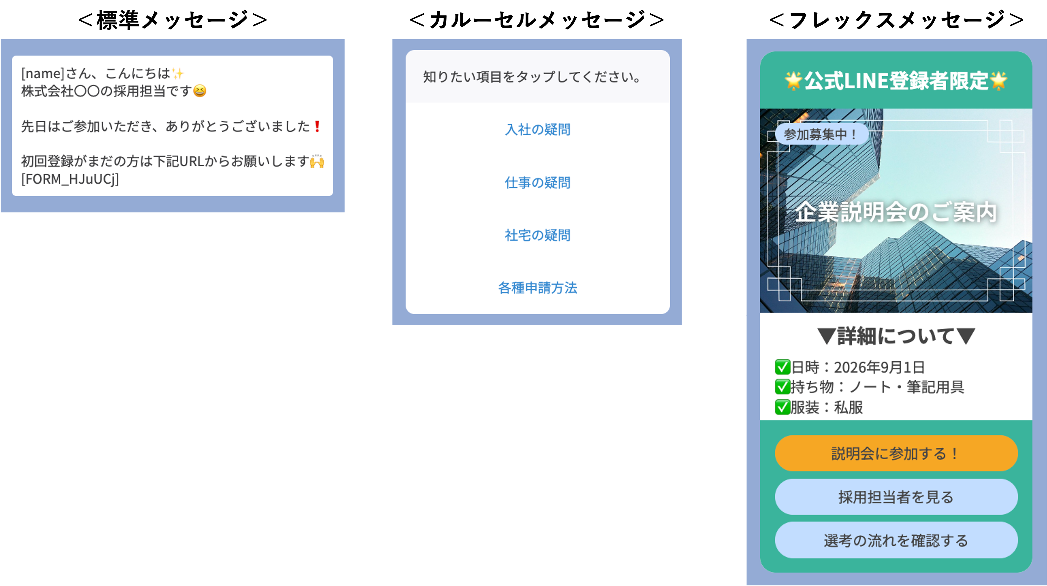 標準メッセージ、カルーセルメッセージ、フレックスメッセージの3種類を用途に合わせて使い分けます。