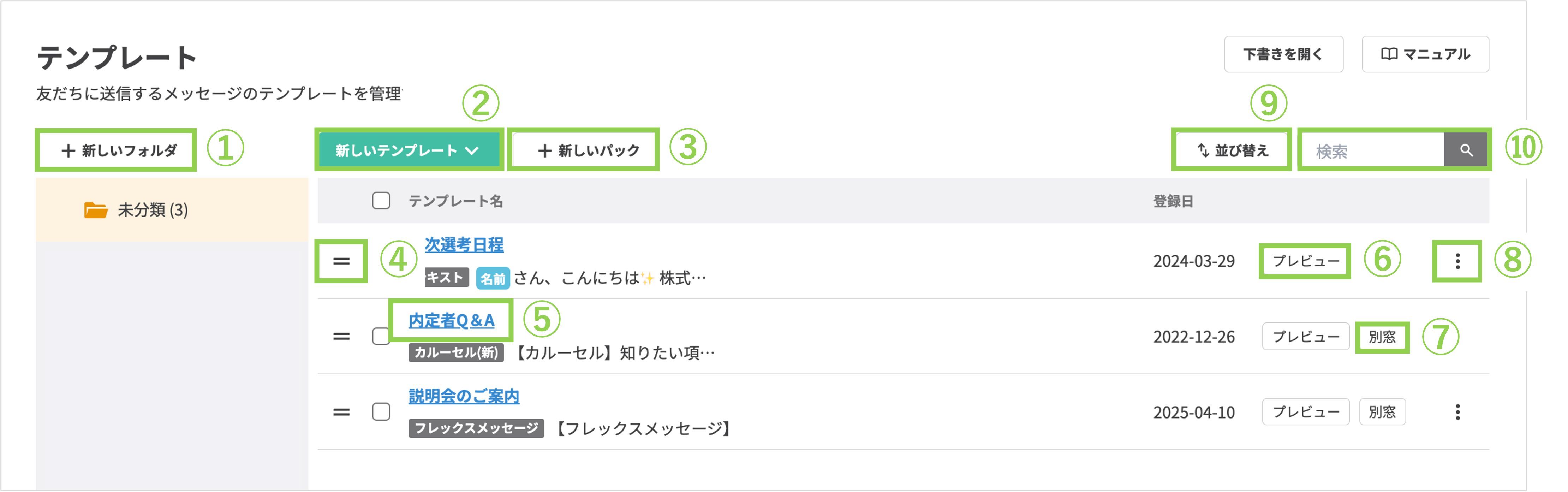 ①〔+新しいフォルダ〕ボタン:登録したテンプレートを分類するためのフォルダを作成できます。