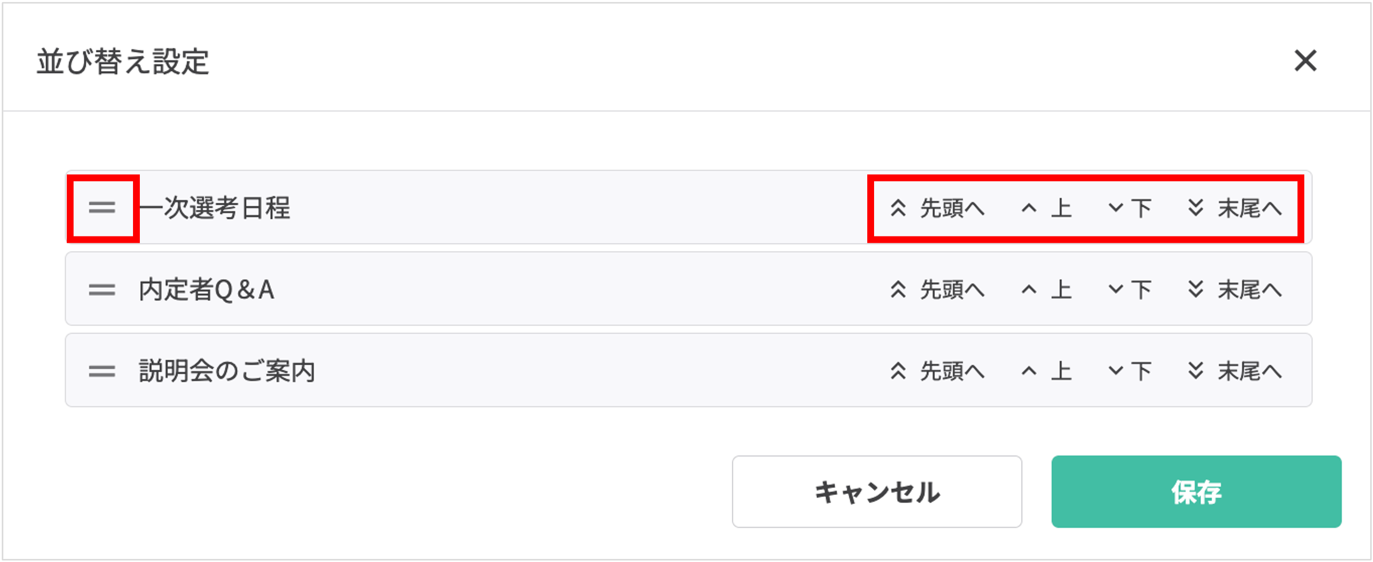 ★「=」をドラッグ、または「先頭へ/上/下/末尾へ」をクリックし、並び替えます。完了したら〔保存〕ボタンをクリックします。