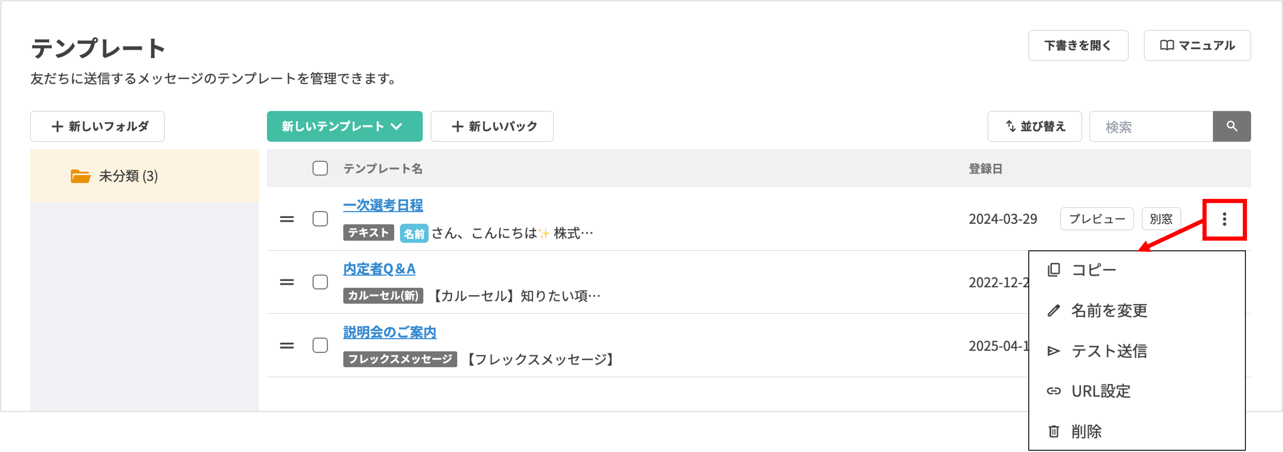 ②〔新しいテンプレート〕ボタン:「標準メッセージ」「カルーセルメッセージ(新方式)」「フレックスメッセージ」から作成したいメッセージを選択して作成画面に移動します。