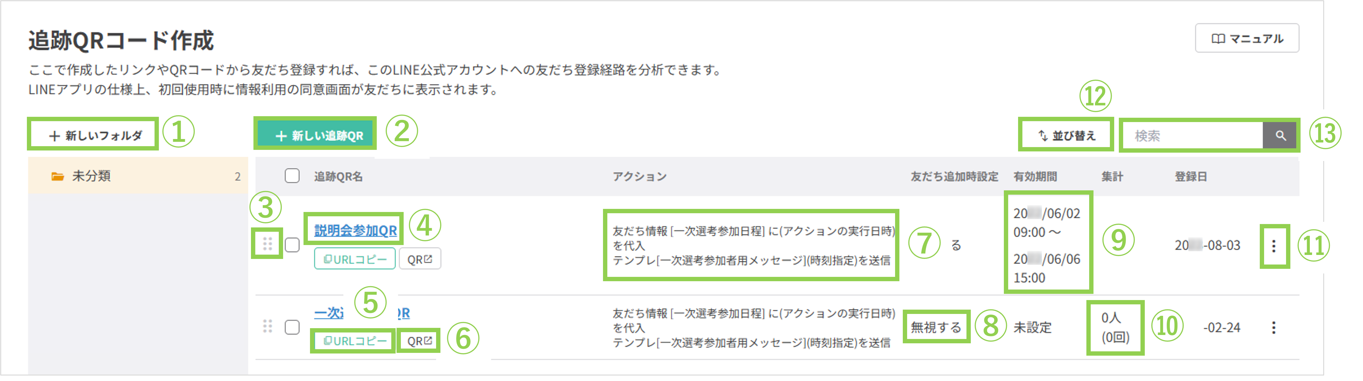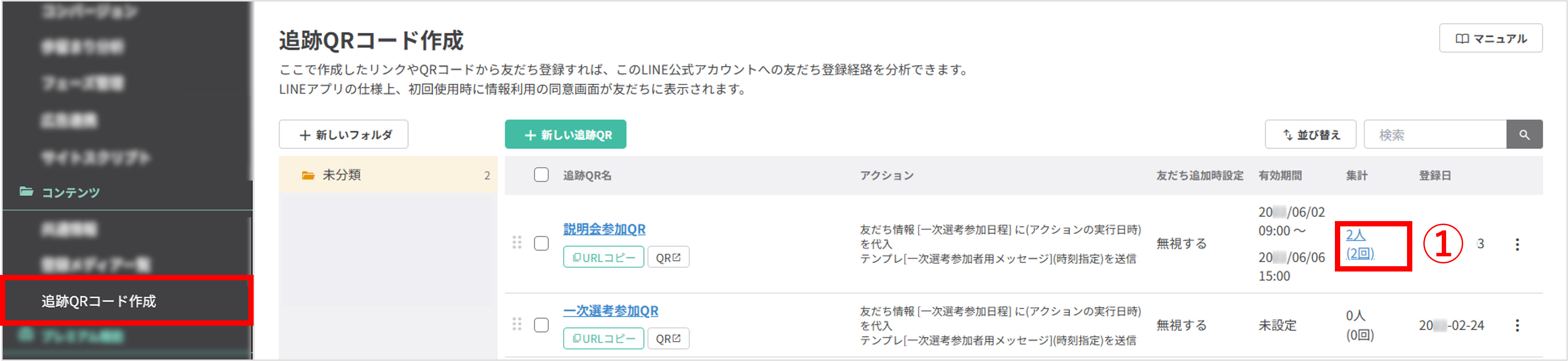 ①〔+新しいフォルダ〕ボタン:登録した追跡QRを分類するためのフォルダを作成できます。
