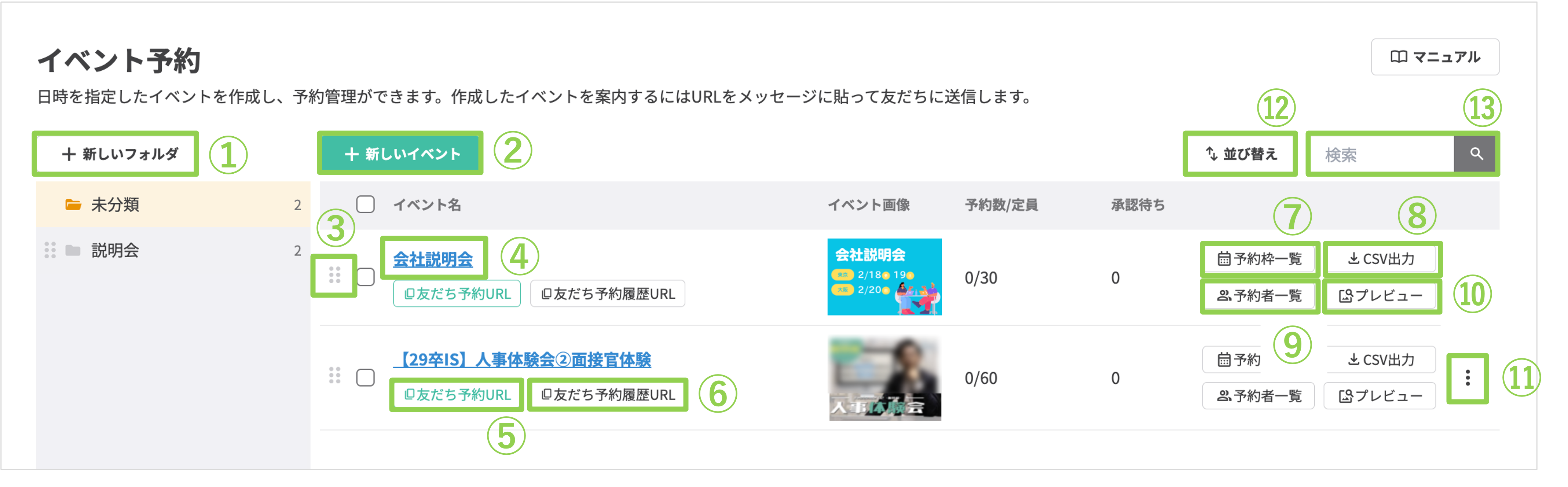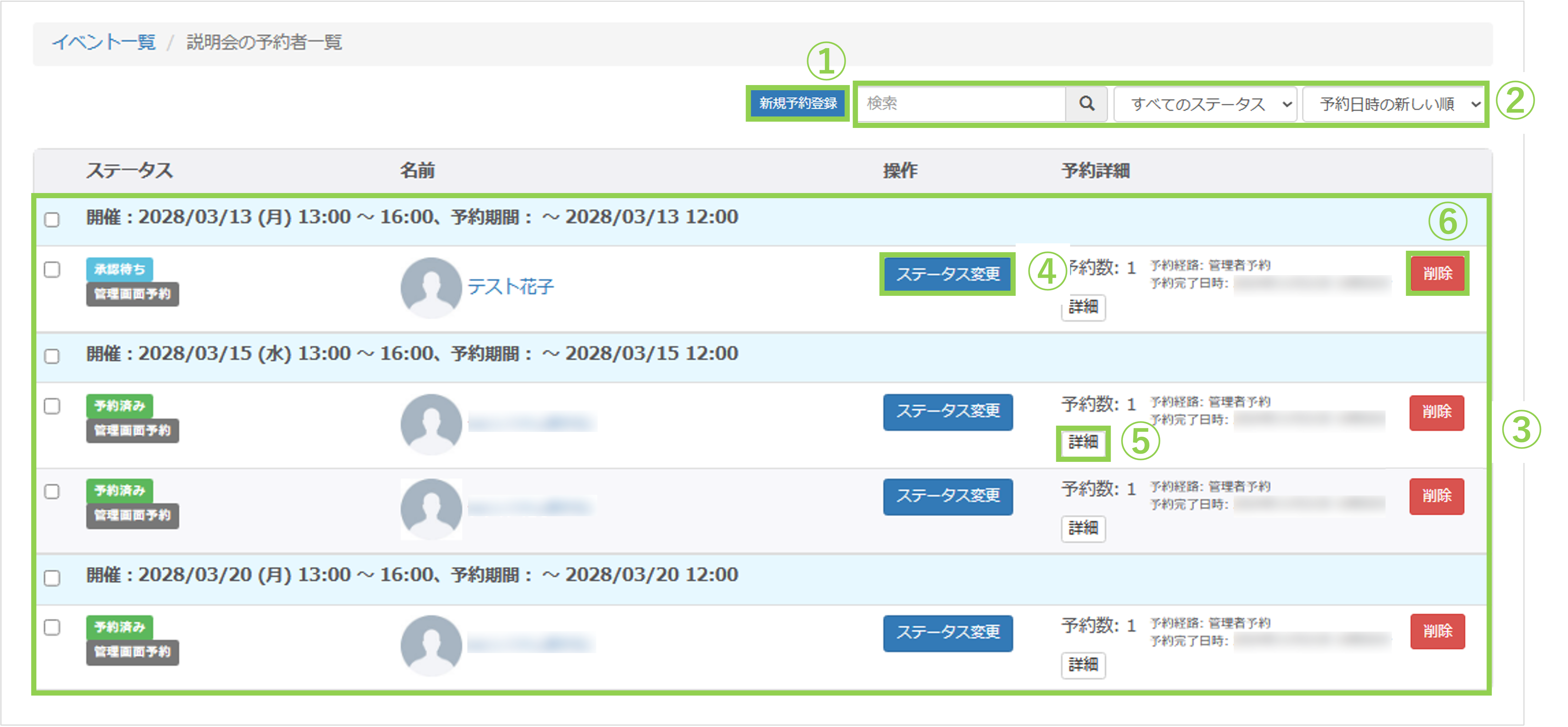 ③検索窓:予約者の名前で検索できます。ステータスによる絞り込みや、予約日時の昇順・降順で並べ替えることも可能です。