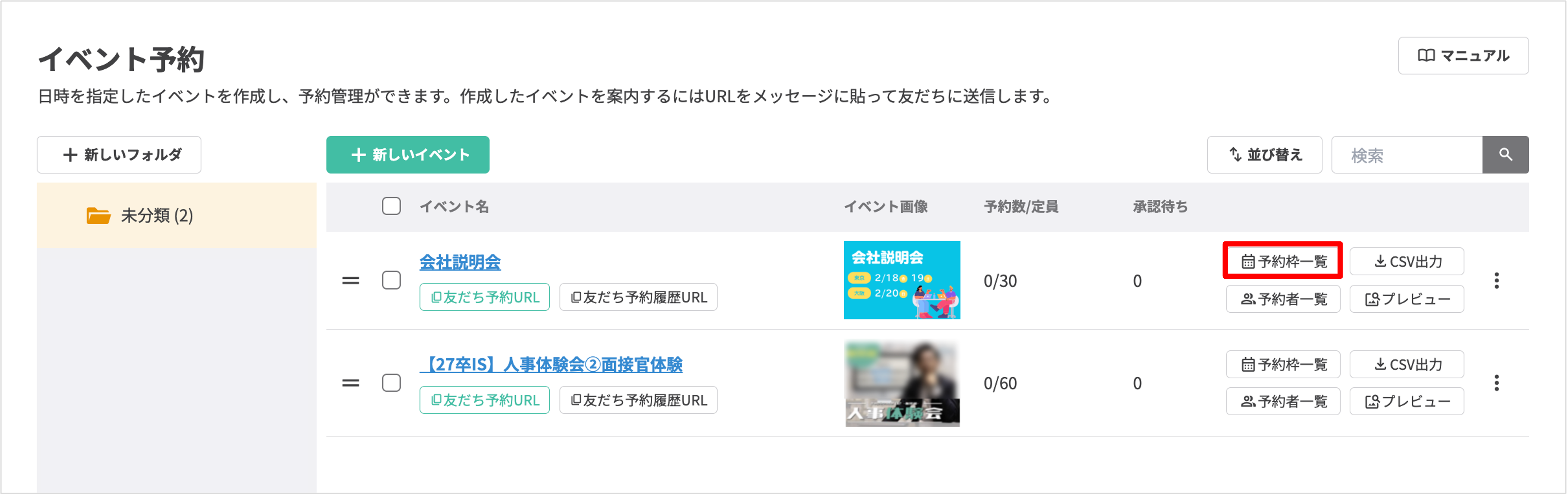 ②予約枠一覧:開催日や締め切り、予約状況などが一覧で表示されます。