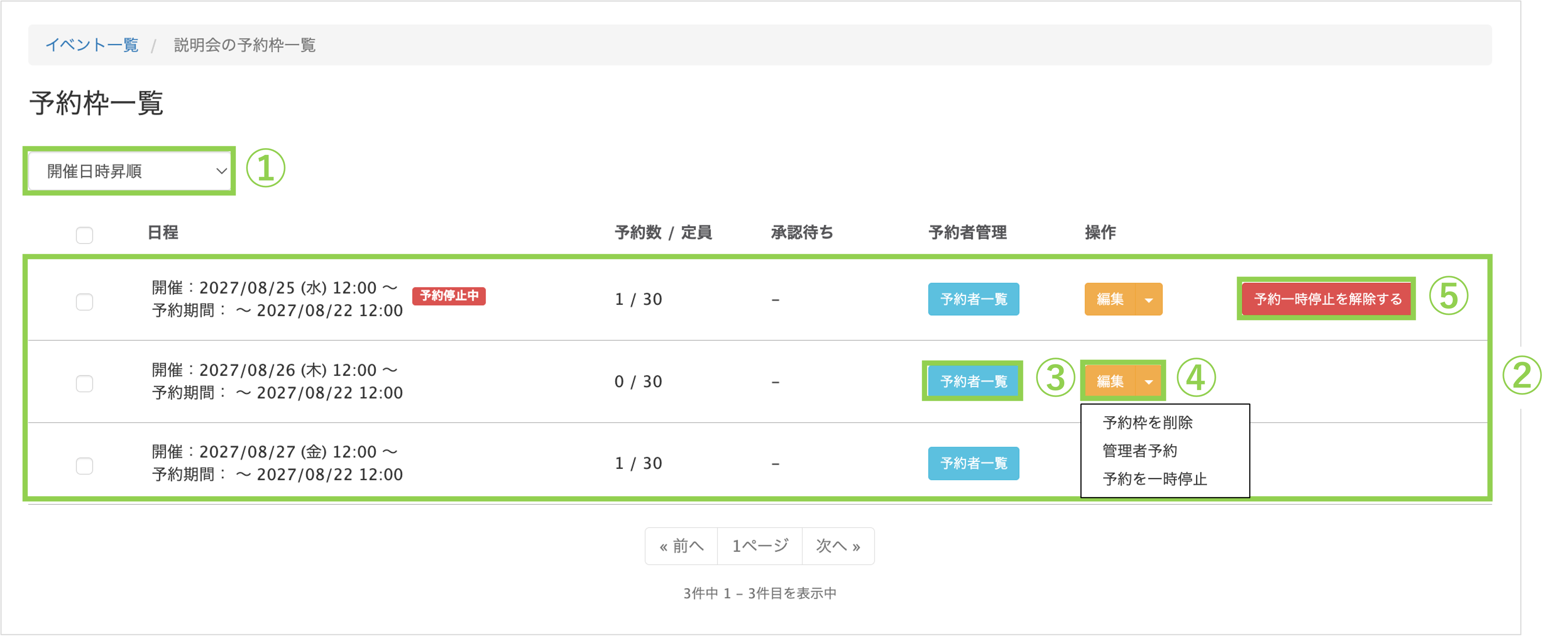 ①並び替え:予約枠を開催日の昇順・降順で並べ替えができます。