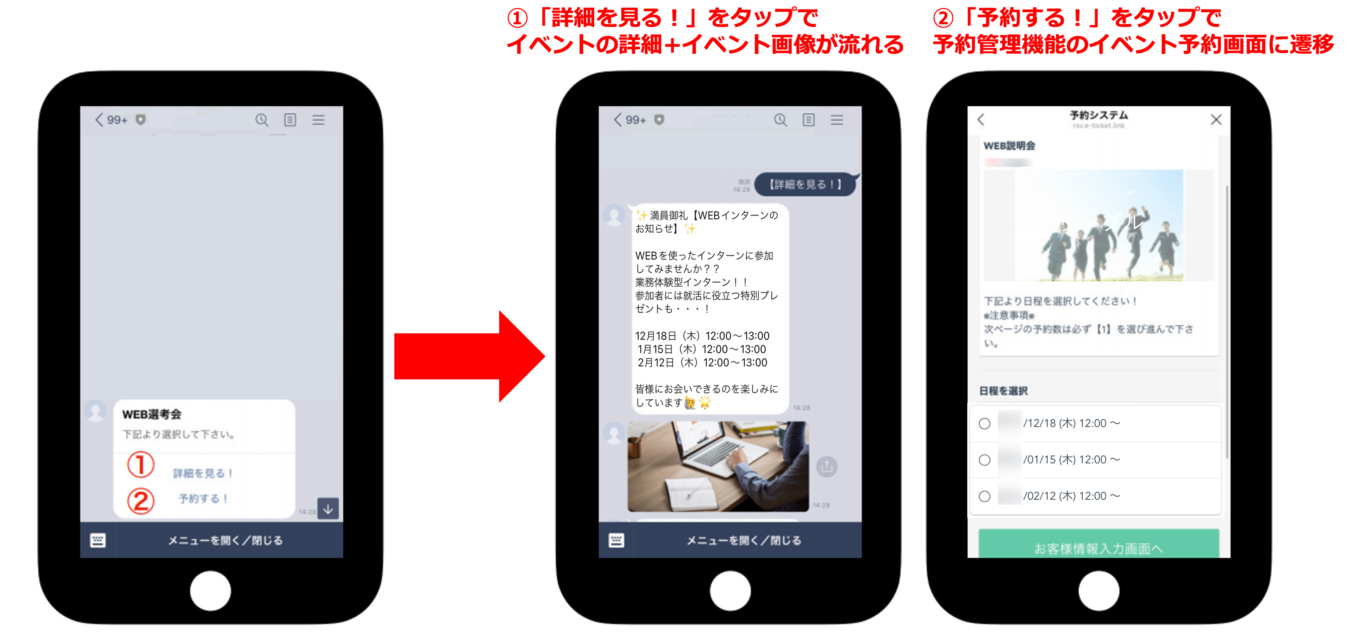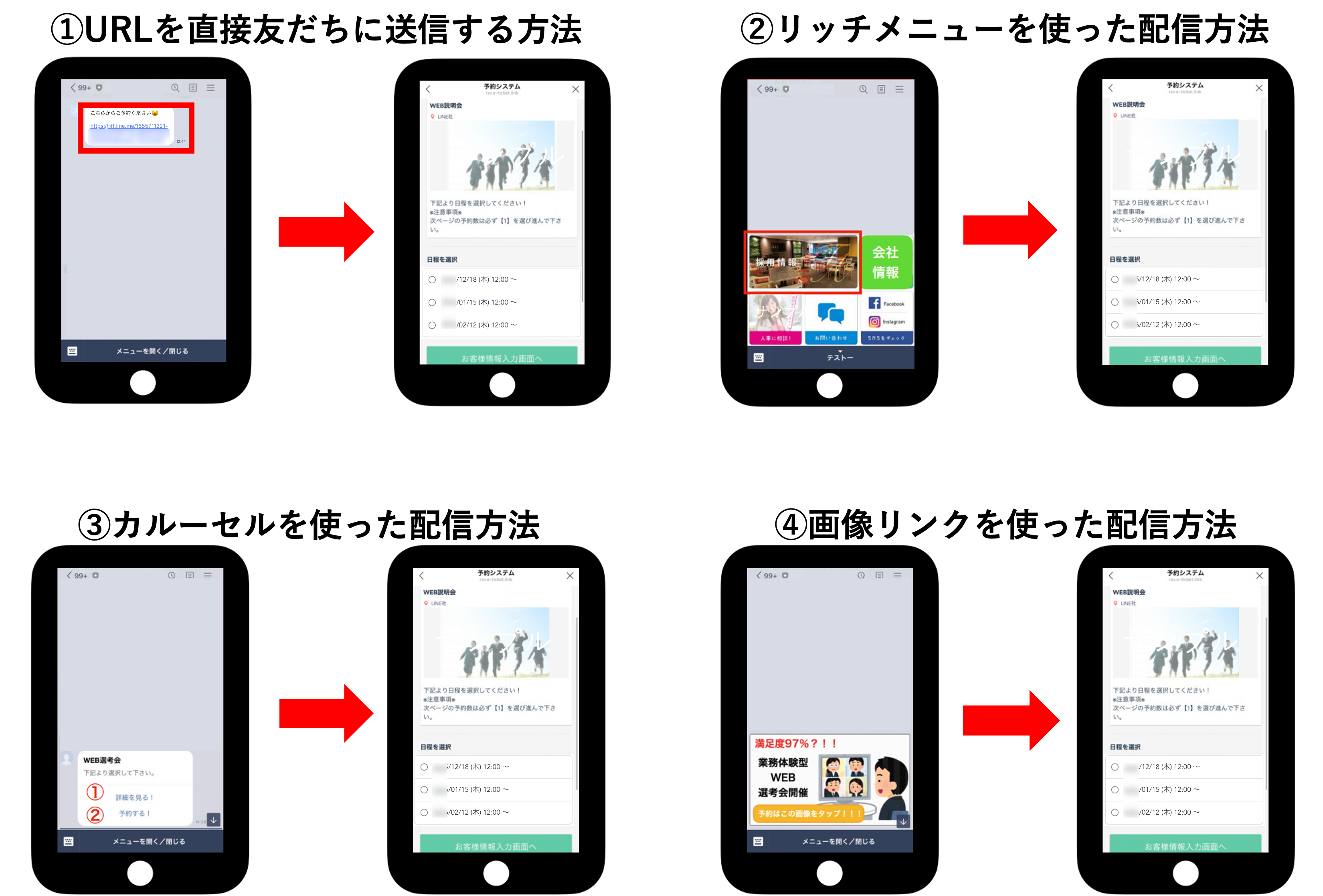 ★予約管理機能で作成したイベントの予約フォームを友だちに届ける方法について解説します。最もシンプルな「URLの直接送信」から、リッチメニューやカルーセル、画像リンクを活用した配信方法まで、まとめて紹介します。